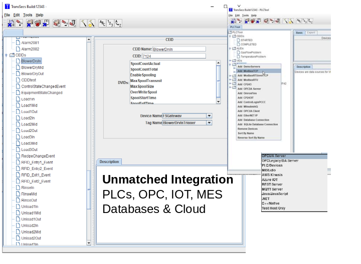 Programmatic TransSECS - the ultimate geeky solution for those adept at C, C++, .net, CSharp, Java, Javascript,or even Python. Pick your language and favorite IDE and use the libraries generated from setting up your SECS/GEM ids and messages in TransSECS to give you a big head start on your development efforts.