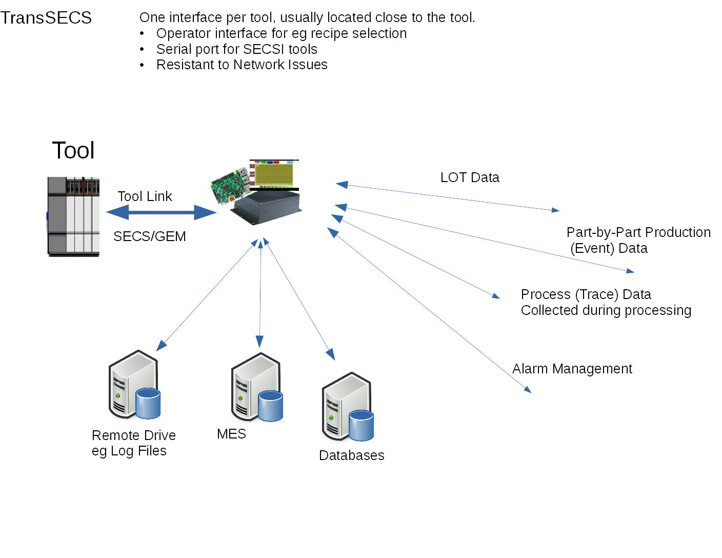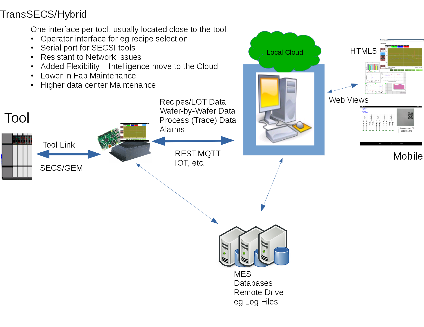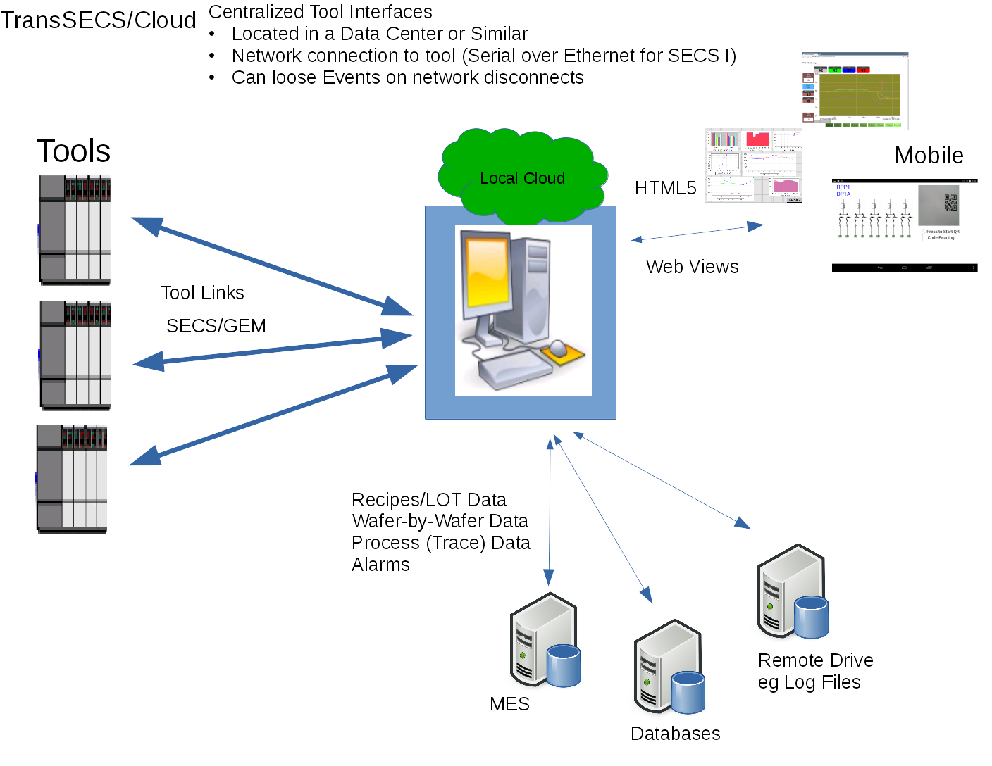ErgoTech's TransSECS software give you the flexibility to create the best solution for your facility. Here are three of the most common architectures. TransSECS Interface at Tool TransSECS/Hybrid TransSECS/Cloud