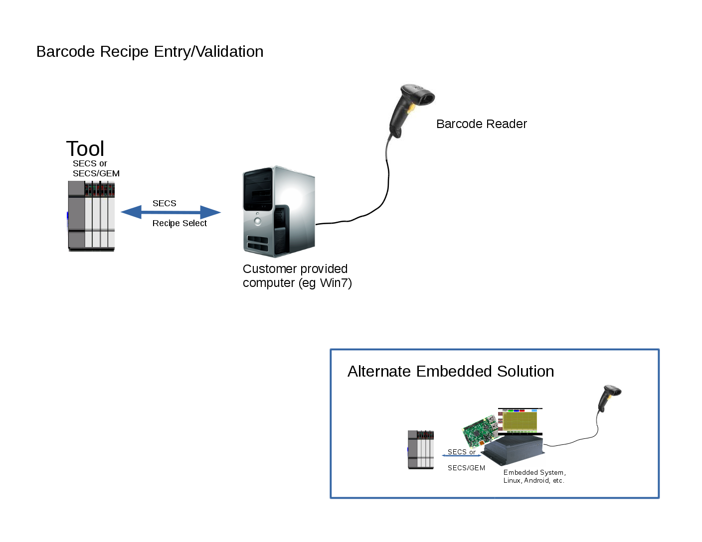 When you don't have a full FAB host there are still problems that ErgoTech's TransSECS can help you resolve. The most pressing is usually ensuring that the correct recipe is run at the tool. If your lot follower has the recipe as a barcode, a simple solution, such as the one below can be provided to you by ErgoTech very economically - typically less than the cost of a few scrapped wafers. And, because it's build with ErgoTech's extensible tools, it can be extended later to include automatic start, data collection, MES/Database Lot lookups, APC, almost anything you could want for supervisory control.